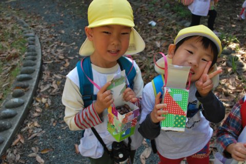 中野公園遠足(年中)(2013/11/06) 年中組の子どもたちが、雨で延期になっていたバス遠足に行きました。 気持ちの良い天気の中、中野公園の森のなかでどんぐり探しをしました。 ここにはどんぐりもたくさんあり、大きなどんぐりもたくさん取れましたよ。 その後、公園で遊んだり、みんなでお弁当を食べたりして、秋の1日を楽しみました。 ツイート