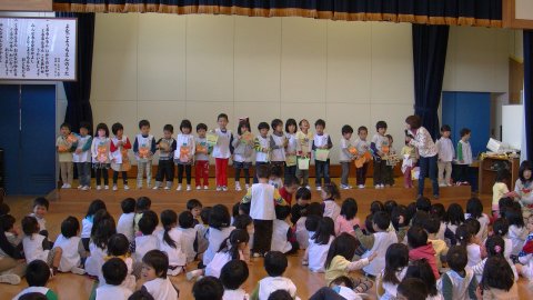今月の誕生会は吉岡先生と手遊びをしたり、エプロンシアターを観たりして楽しみました。