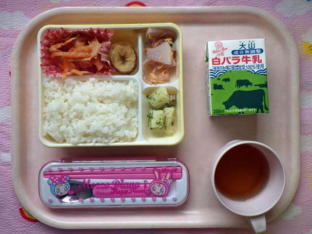 豚肉と大豆☆栄養満点☆(2014/01/08) ★ ごはん ◆●ポークビーンズ ★●じゃが芋のり塩炒め ◆●大根梅サラダ ● バナナ ※あたたかいご飯はおかわり自由です。 ※牛乳は希望者のみです。 ★熱や力になるもの ◆血や肉になるもの ●体の調子を整えるもの ツイート