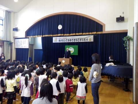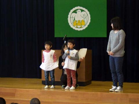 三学期始業式(2014/01/07) 三学期の始業式を行いました。 みんなで歌を歌ったり、三学期から入園の子どもたちの紹介をしたりしました。 また、今年一年いろいろな事がウマく行くよう、また、良いことが駆け込んでくるよう、園長先生がウマに変身して、みんなにお話をしました。 ツイート