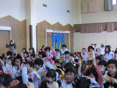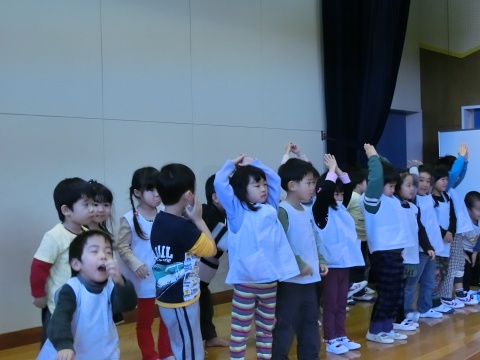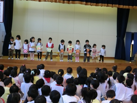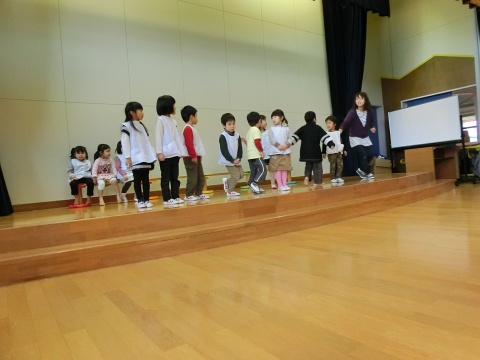 今月の誕生会は、みんなで「しゅりけんにんじゃ」の遊びをしたり、「みにくいあひるの子」のスライドを観たりして楽しみました。