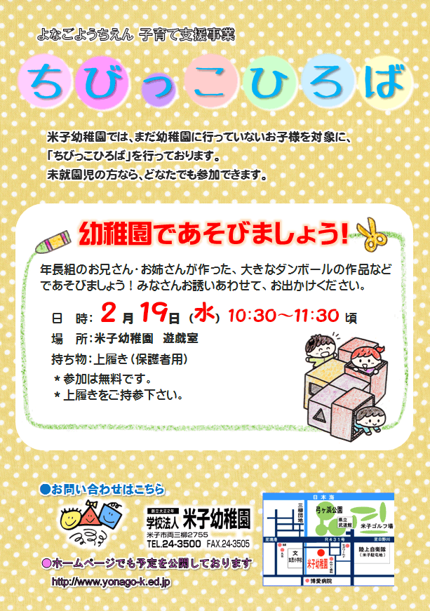 米子幼稚園では、まだ幼稚園に行っていないお子様を対象に、「ちびっこひろば」を行っております。未就園児の方なら、どなたでも参加できます。