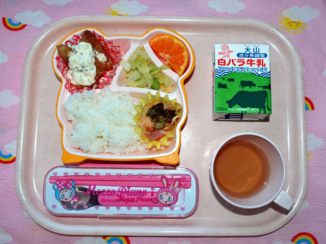 緑のお野菜の集合だ!(2014/01/31) ★ ごはん ◆●白身フライ タルタルソース ◆●野菜のトマト煮 ● グリーンサラダ ●みかん ※あたたかいご飯はおかわり自由です。 ※牛乳は希望者のみです。 ★熱や力になるもの ◆血や肉になるもの ●体の調子を整えるもの ツイート