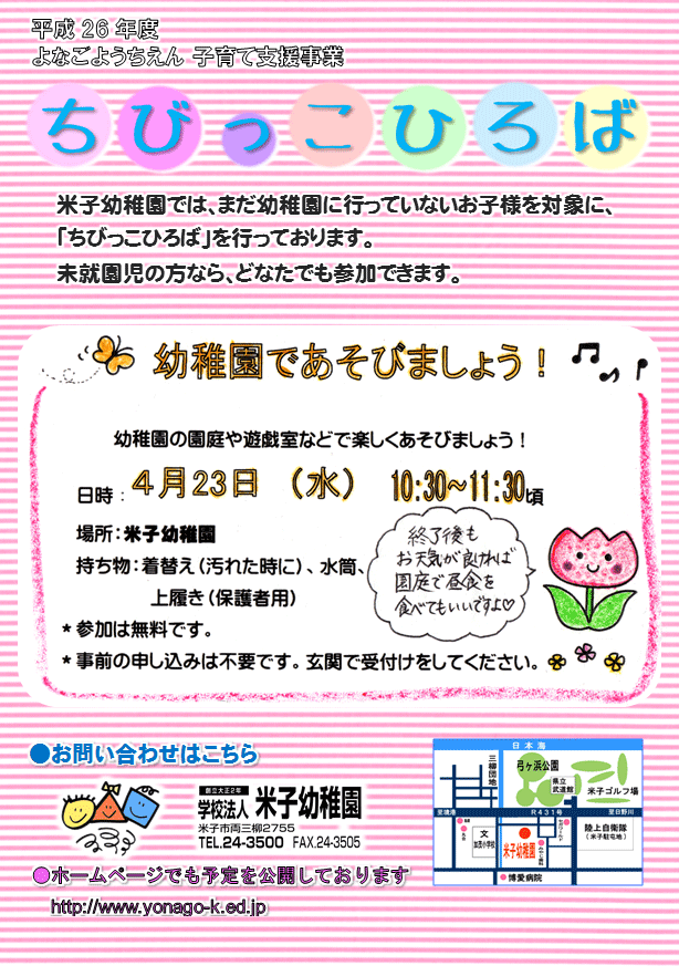 米子幼稚園では、まだ幼稚園に行っていないお子様を対象に、「ちびっこひろば」を行っております。未就園児の方なら、どなたでも参加できます。