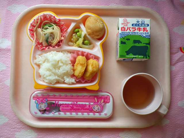 きれいな春色★菜の花パスタ★(2014/03/07) ★ ごはん ★◆●菜の花パスタ ◆ チキンナゲット ◆●ビーンズサラダ ★ シュークリーム ※あたたかいご飯はおかわり自由です。 ※牛乳は希望者のみです。 ★熱や力になるもの ◆血や肉になるもの ●体の調子を整えるもの ツイート