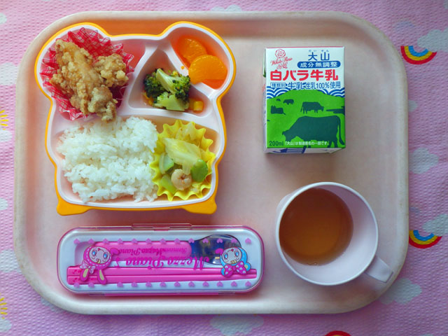 大好き★唐揚げの登場だ!(2014/05/16) ★ ごはん ◆ 鶏の唐揚げ ◆●そら豆の中華炒め ● 花野菜サラダ ★ みかん缶 ※あたたかいご飯はおかわり自由です。 ※牛乳は希望者のみです。 ★熱や力になるもの ◆血や肉になるもの ●体の調子を整えるもの ツイート