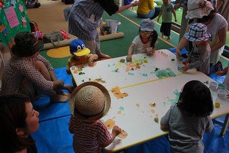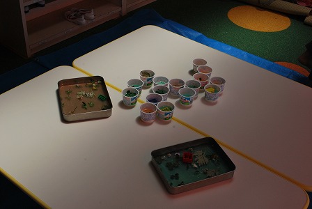 園庭で摘んだ草花、ブロックを入れて固めた寒天。手でちぎってグチャグチャしたり、カップに入れたり・・・。