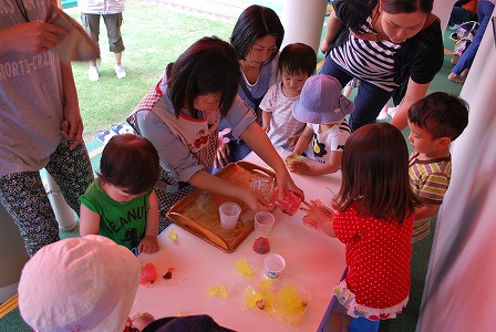 いろんな色があるね!カップにすくってジュース屋さんごっこです。