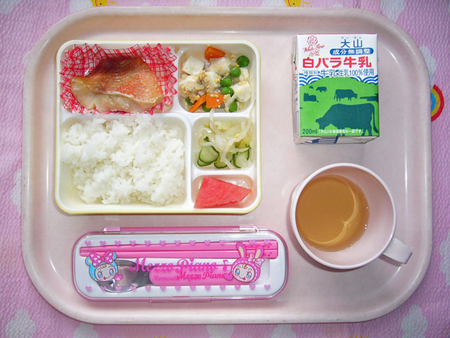 今日の主役はお魚さん♪(2014/06/23) ★ ごはん ◆ 赤魚の煮付け ◆●炒り豆腐 ◆●白菜の甘酢和え ● スイカ ※あたたかいご飯はおかわり自由です。 ※牛乳は希望者のみです。 ★熱や力になるもの ◆血や肉になるもの ●体の調子を整えるもの ツイート