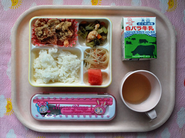 夏野菜たっぷりラタトィユ★(2014/07/02) ★ ごはん ◆ 鶏の竜田揚げ ◆●ラタトィユ ◆●春雨サラダ ● スイカ ※あたたかいご飯はおかわり自由です。 ※牛乳は希望者のみです。 ★熱や力になるもの ◆血や肉になるもの ●体の調子を整えるもの ツイート