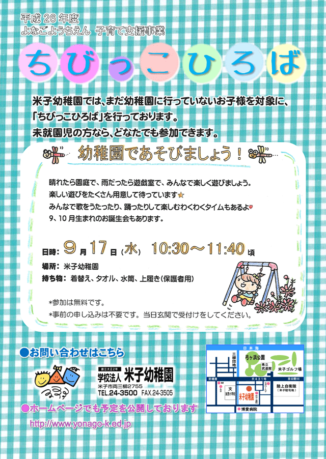 未就園児対象 子育て支援事業「幼稚園であそぼう!」(2014/09/17) 晴れたら園庭で、雨だったら遊戯室で、みんなで楽しく遊びましょう。 楽しい遊びをたくさん用意して待っています。 みんなで歌をうたったり、踊ったりして楽しむわくわくタイムもあるよ。 9、10月生まれのお誕生会もあります。 日時:9月17日(水) 10:30~11:40頃 米子幼稚園にて ※着替え、タオル、水筒、上履き ※参加無料です。事前受付は不要です。当日玄関で受付をしてください。 ツイート