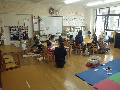 お部屋でも、お母さんたちとお絵かき、粘土、ままごと、ブロックをしてゆったりと遊びました!