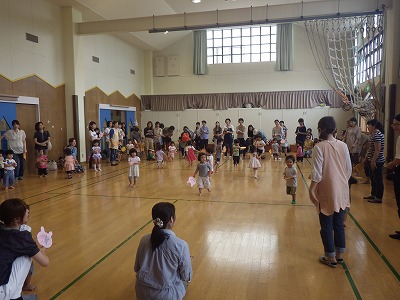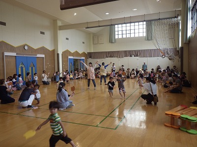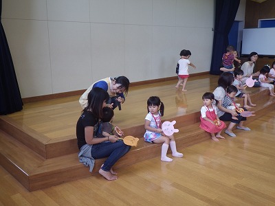 受付時に、うさぎ、くま、ねこの動物うちわに親子でお顔を書いてもらいました。そのかわいいうちわを持って、遊戯室で「元気音頭」「おどるポンポコリン」の曲に合わせて、 元気いっぱい踊りました \(^o^)/