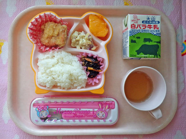 今日は鮭をから揚げにしました☆(2014/09/29) ★ ごはん ◆ 鮭のから揚げ ◆●ひじき煮 ★●さつま芋の和風サラダ ● 柿 ※あたたかいご飯はおかわり自由です。 ※牛乳は希望者のみです。 ★熱や力になるもの ◆血や肉になるもの ●体の調子を整えるもの ツイート