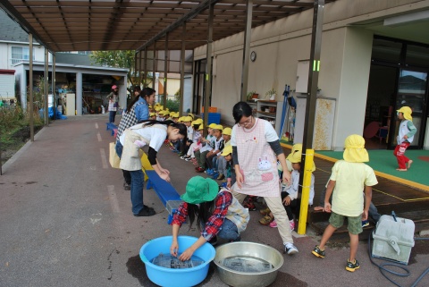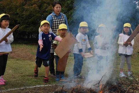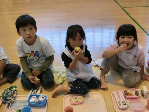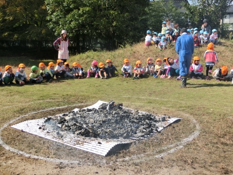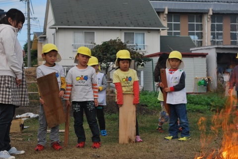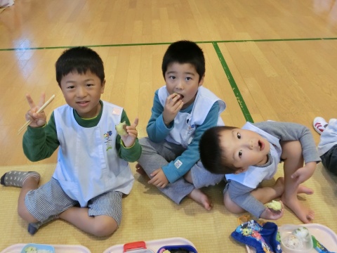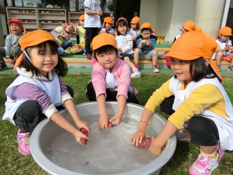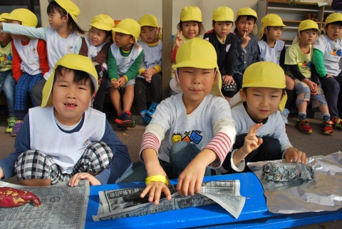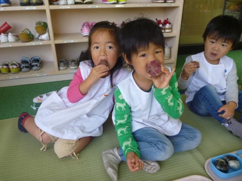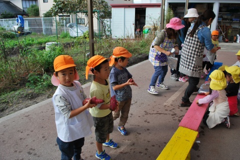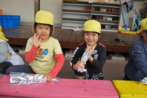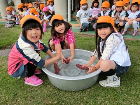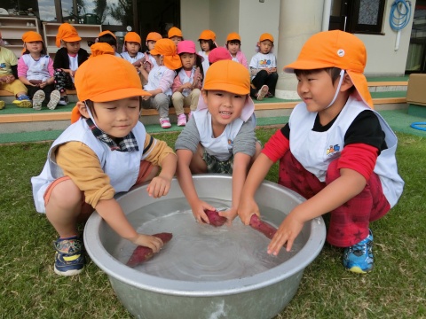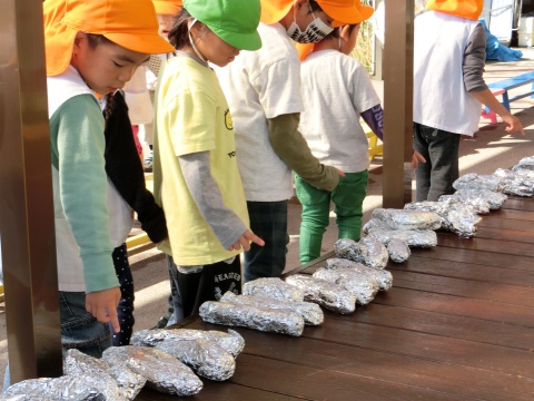 やきいも(全園児)(2014/11/04) みんなでいもほりをした芋を使って焼き芋をしました。 薪を運んだり、芋を洗ったりみんなで手分けをして準備をしました。 芋が焼けるまでの時間に、みんなでいっしょにゲームをしたり、歌を歌ったりして楽しみました。 そして、ホクホクにやけた焼き芋をみんなでいっしょに食べました。 ツイート