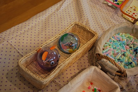 ガチャガチャカプセルの中に、どんぐり、大きめのビーズ、短く切ったストローなどの材料を入れ、シールや目玉を貼ったりして、可愛いマラカスが出来ました♡