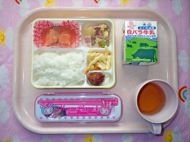 甘い白菜いっぱい♪ベーコン煮(2015/01/30) ★ ごはん ◆ 鮭のオーロラソースかけ ◆●白菜ベーコン煮 ★●マカロニサラダ ◆ ミートボール ※あたたかいご飯はおかわり自由です。 ※牛乳は希望者のみです。 ★熱や力になるもの ◆血や肉になるもの ●体の調子を整えるもの ツイート