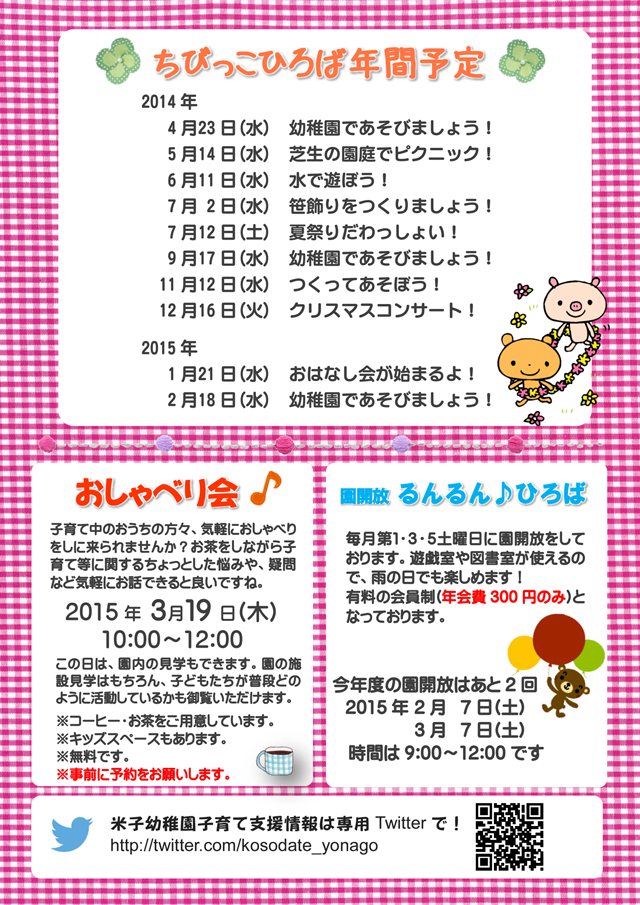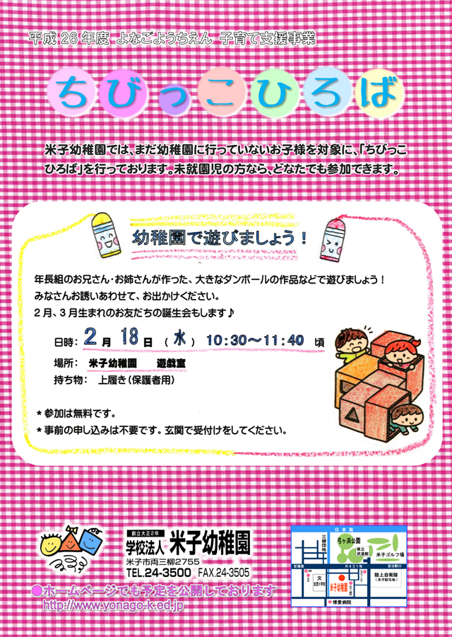 米子幼稚園では、まだ幼稚園に行っていないお子様を対象に、「ちびっこひろば」を行っております。未就園児の方なら、どなたでも参加できます。