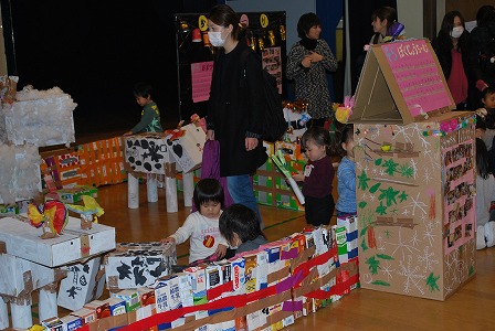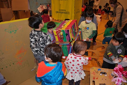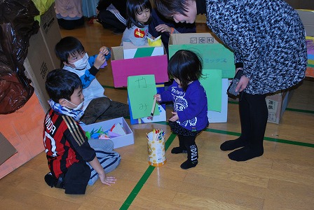 今回は、年長組のお兄さんお姉さんたちが作った、大きなダンボールの作品で遊びました。