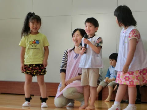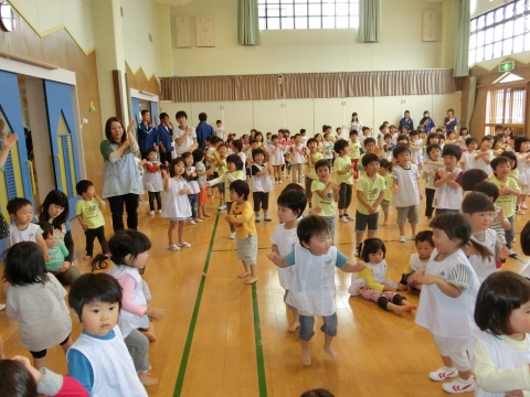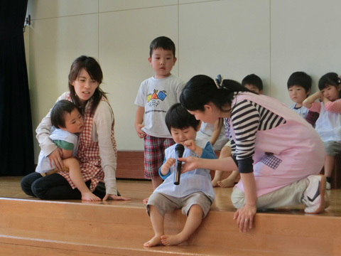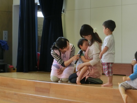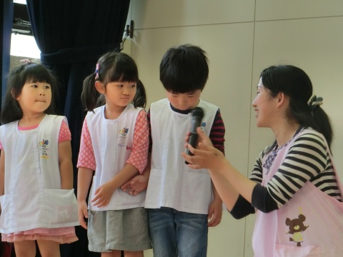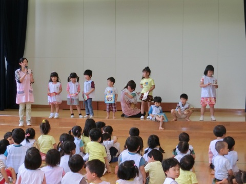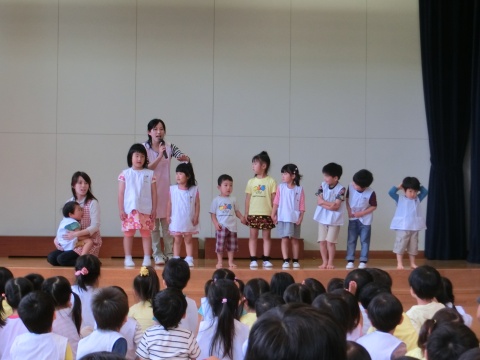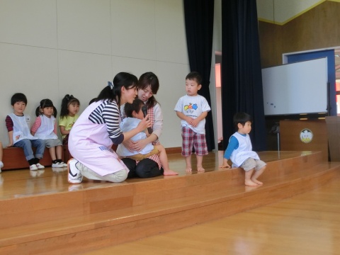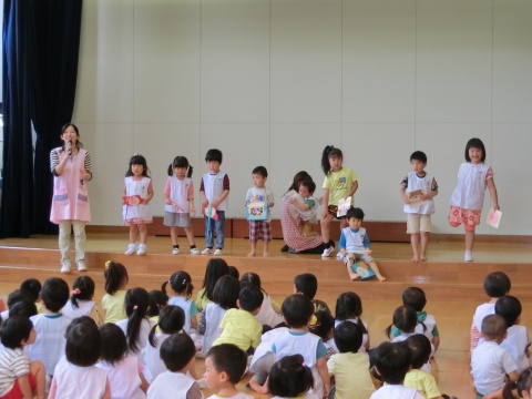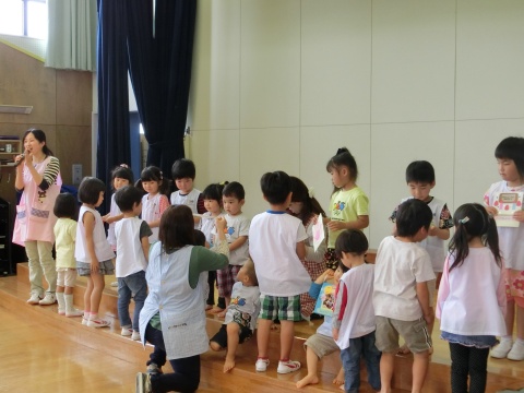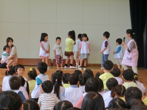 今月の誕生会は、加茂中学校の職場体験の生徒さん達と一緒に遊んだり、パネルシアターを観たりして楽しみましたよ。
