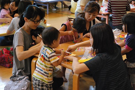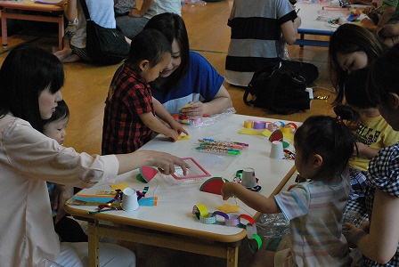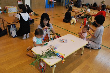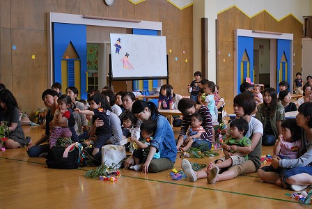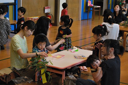 朝からしとしと梅雨の空…そんな天気の中でしたが、43組の親子のみなさんが遊びに来てくださいました!お星さまに顔を描いてロケットを作ったり、すいかの種を描いたり、短冊に親子で願い事を書いて、それから幼稚園の裏庭でとった小さな笹(子どもさんにひとつずつ)に親子で飾りをつけたら出来上がりです!みんな素敵な笹飾りが出来ていましたね!みなさんのお願い事がどうぞ叶いますように…☆