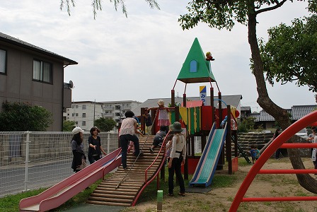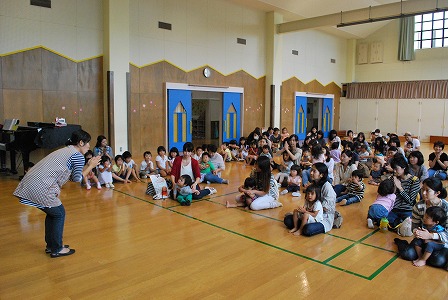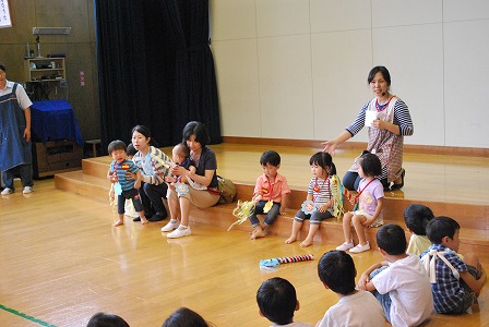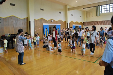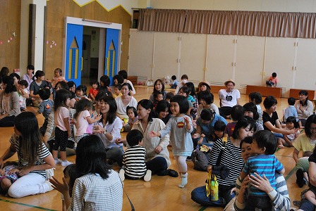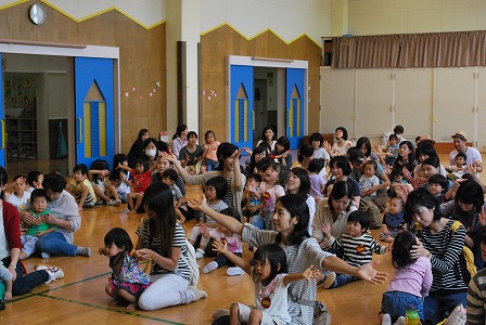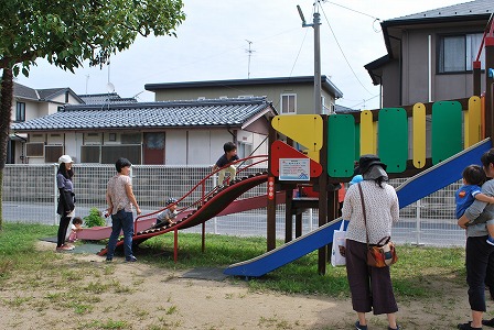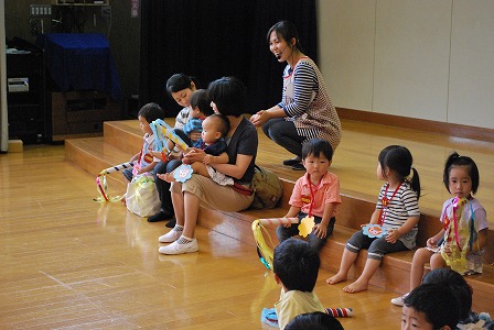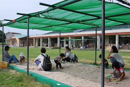 「雨が降るのでは…」と心配された天気でしたが、くもり空からだんだんお日様が出てきて、気持ちのいい天気になりました。今回は、47組の親子のみなさんが遊びに来てくださいました!