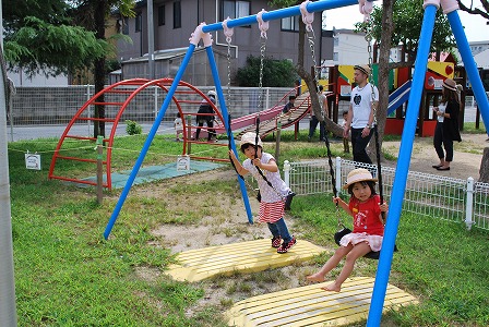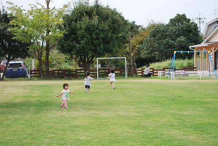 気持ちのいい天気の中、園庭でお気に入りの遊具で遊んだり、芝生の上を走ったり、たくさんのニコニコ笑顔が見られました!