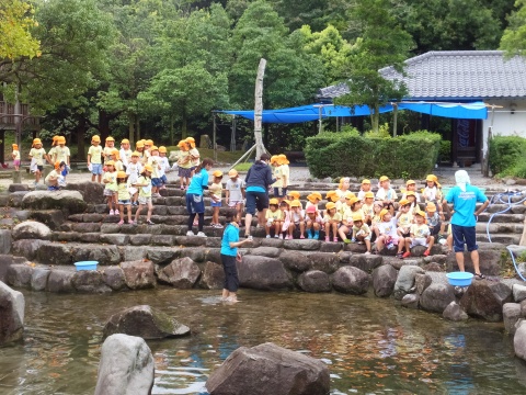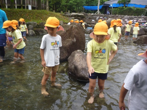 係りの人の説明を真剣に聞いた後、ジャブジャブ広場の池に魚を放流してもらい、裸足になって魚を追いかけ手掴みで魚を捕まえました。