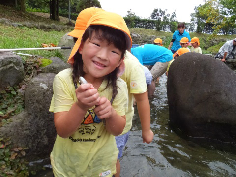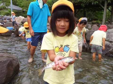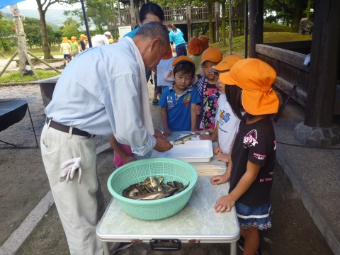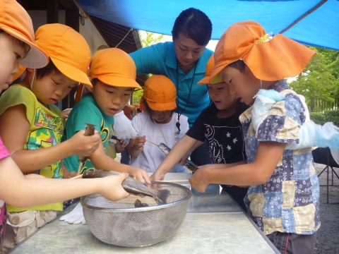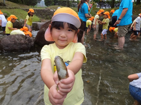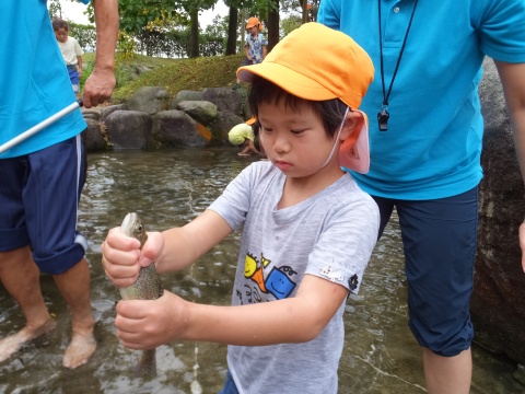 魚はぬるぬるしてつかみにくく、初めて魚をさわった子どもがほとんどで、驚いたり恐がったり、なかなか捕まえることが出来ませんでしたが、やっと捕まえた子どもたちは大喜びでした。