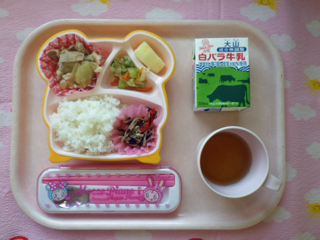 ごはんが進む!生姜焼き♪ ★ ごはん ◆●豚肉の生姜焼き ◆●じゃこひじき炒め ● チンゲン菜の胡麻和え ● りんご ※あたたかいご飯はおかわり自由です。 ※牛乳は希望者のみです。 ★熱や力になるもの ◆血や肉になるもの ●体の調子を整えるもの ツイート