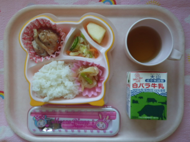 チキンとトマト★相性バッチリ! ★ごはん ◆●チキントマトソース ★◆●ツナじゃが ●コールスロ-サラダ ●りんご ※あたたかいご飯はおかわり自由です。 ※牛乳は希望者のみです。 ★熱や力になるもの ◆血や肉になるもの ●体の調子を整えるもの ツイート