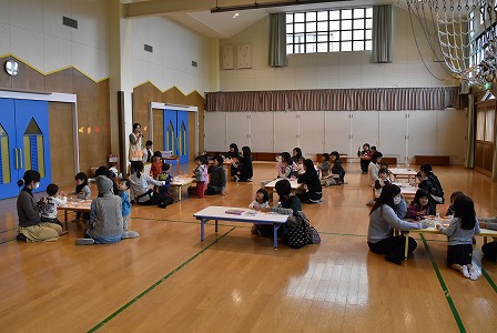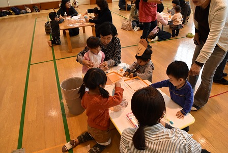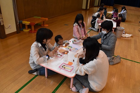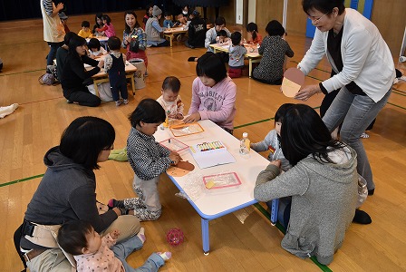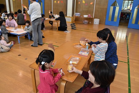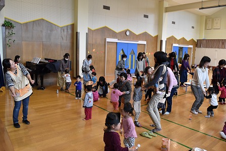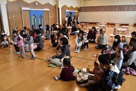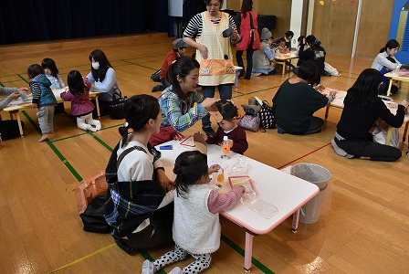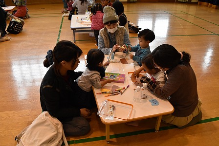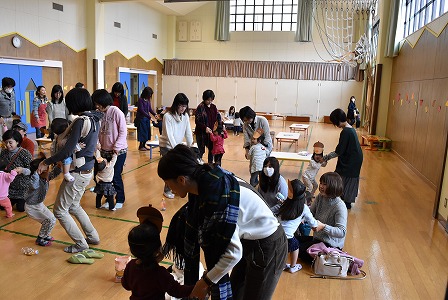 幼稚園の玄関前のいちょうの木の葉もきれいに色づき、吹く風もだんだん冷たくなり、秋を感じる季節になりましたね!今回は、28組の親子のみなさんが、遊びに来て下さいました!