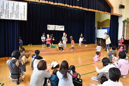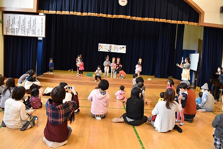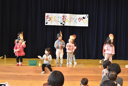 作ったマラカスや幼稚園の楽器(すず、タンバリン、カスタネット)を使って、「ちびっこおんがくかい」をしました!ステージの上で、それからお母さんの傍で、ひとりひとり それぞれの楽しみ方で音楽会に参加できていましたね!みんなの音が合わさって、すてきな音楽会になりました♪