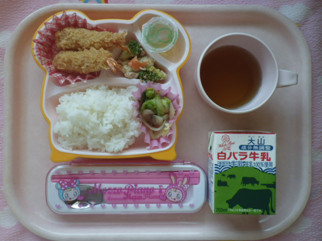 サクッとおいしい☆エビフライ! ★ごはん ◆エビフライ ◆●白菜ベーコン煮 ◆●ツナサラダ ★ゼリー ※あたたかいご飯はおかわり自由です。 ※牛乳は希望者のみです。 ★熱や力になるもの ◆血や肉になるもの ●体の調子を整えるもの ツイート