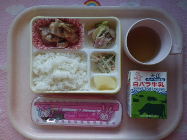 チキンとトマト★相性ぴったり! ★ごはん ◆●チキントマトソース ◆●ブッロコリ―のソテー ◆●ごぼうサラダ ★洋ナシ缶 ※あたたかいご飯はおかわり自由です。 ※牛乳は希望者のみです。 ★熱や力になるもの ◆血や肉になるもの ●体の調子を整えるもの ツイート
