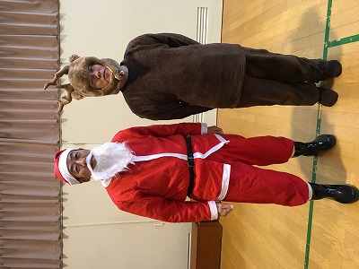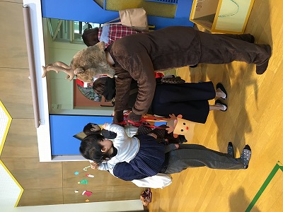 すると、鈴の音が聞こえて…サンタさんとトナカイさんがみんなにプレゼントをもって来てくれました!そして、サンタさんとトナカイさんから一人一人にプレゼントをいただきました♡なかなか会えないサンタさんトナカイさんの登場に大喜びの子、びっくりする子もいました(*^_^*)