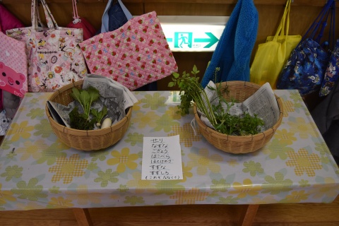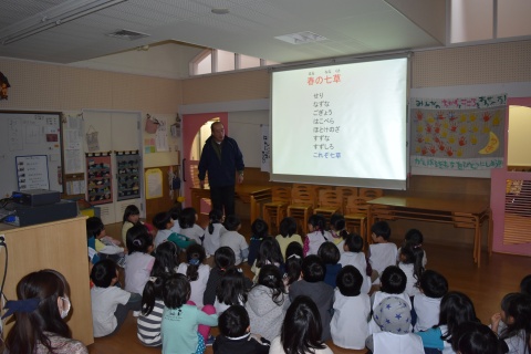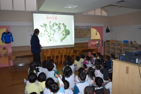 スライドを使って七草粥の由来や、野草についての説明などをみたり、実際に使われている野草をみたりしました。