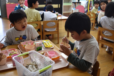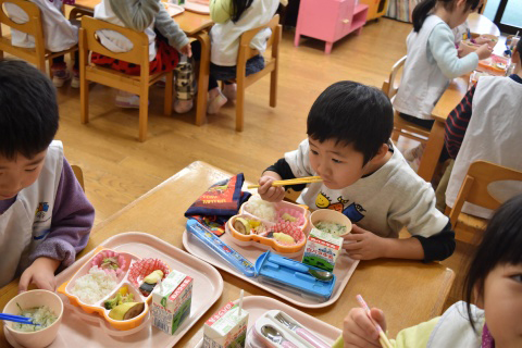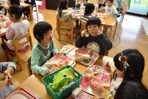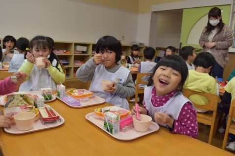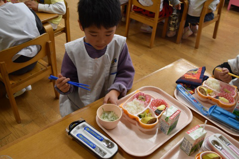 本来なら七草粥は昨日の7日に食べるという事ですが、今日の給食の時間にいただきました。また、この七草粥は、園の庭や菜園など身近なところから採られたものを使いまいした。