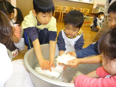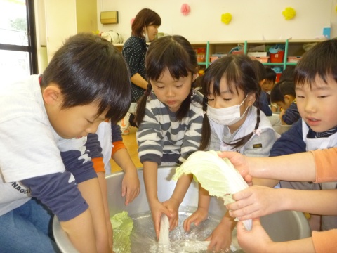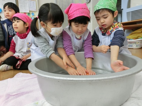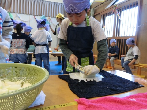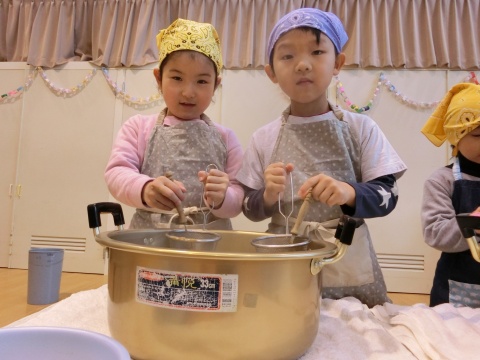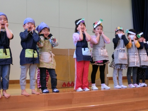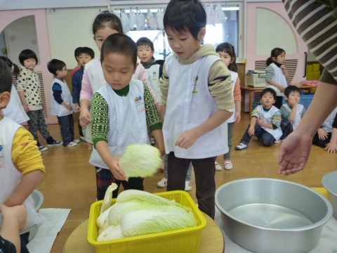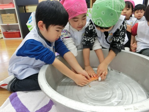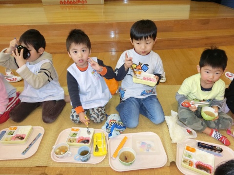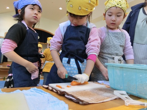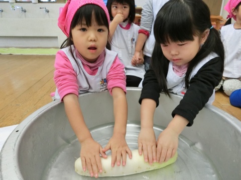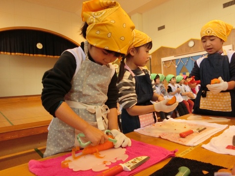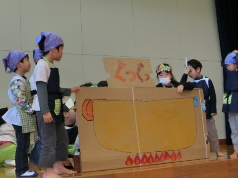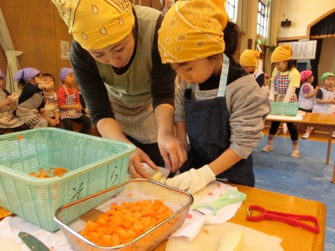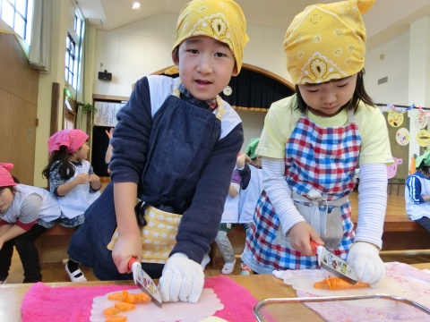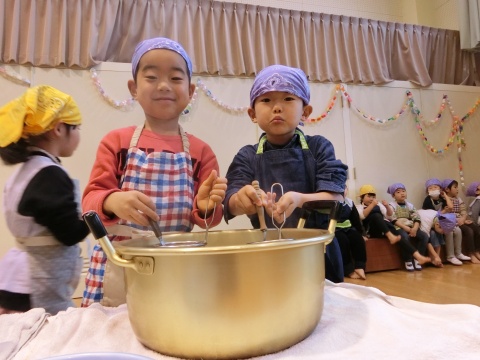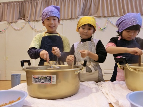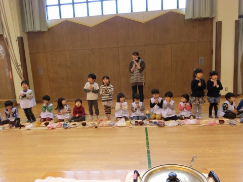 みそ汁パーティー(つき・ゆり・うさぎ・くま)(2016/01/20) つき・ゆり・うさぎ・くま組の子どもたちが、みそ汁パーティーをしました。 園の菜園で採れた野菜も使って、みんなで仕事を分担して、作りました。 野菜を洗ったり切ったりした後、煮込んでいる時間を利用して楽しい出し物をしました。 年長組の子どもたちが考えた、みそ汁が出来上がるまでの劇をみたり、手遊びをしたりしました。 出来上がったみそ汁はみんなで一緒に食べました。とっても美味しかったですよ。 ツイート