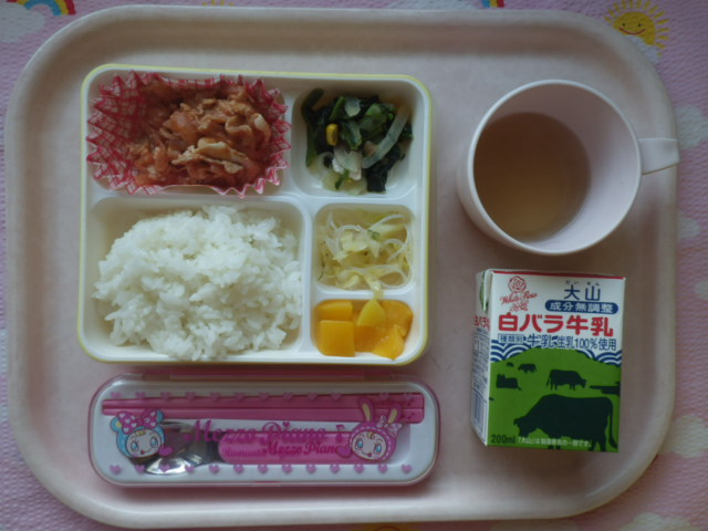 豚肉と大豆★栄養満点! ★ごはん ◆●ポークビーンズ ◆●ほうれん草ソテー ●春雨サラダ ★黄桃缶 ※あたたかいご飯はおかわり自由です。 ※牛乳は希望者のみです。 ★熱や力になるもの ◆血や肉になるもの ●体の調子を整えるもの ツイート