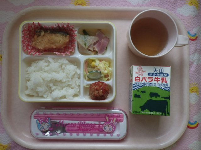 栄養がつまった鮭の竜田揚げ★ ★ごはん ◆鮭の竜田揚げ ◆●大根とベーコンのソテー ●コールスローサラダ ◆ミートボール ※あたたかいご飯はおかわり自由です。 ※牛乳は希望者のみです。 ★熱や力になるもの ◆血や肉になるもの ●体の調子を整えるもの ツイート
