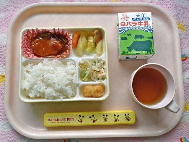 ハンバーグにはやっぱりデミソース★(2016/02/26) ★ ごはん ◆●ハンバーグ デミソースかけ ◆●ポトフ ◆●チキンサラダ ★ フライドポテト ※あたたかいご飯はおかわり自由です。 ※牛乳は希望者のみです。 ★熱や力になるもの ◆血や肉になるもの ●体の調子を整えるもの ツイート