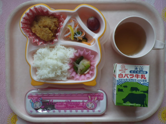 カレー風味で食欲アップ! ★ごはん ◆タラのカレー揚げ ◆●白菜ベーコン煮 ●春雨サラダ ●ぶどう ※あたたかいご飯はおかわり自由です。 ※牛乳は希望者のみです。 ★熱や力になるもの ◆血や肉になるもの ●体の調子を整えるもの ツイート