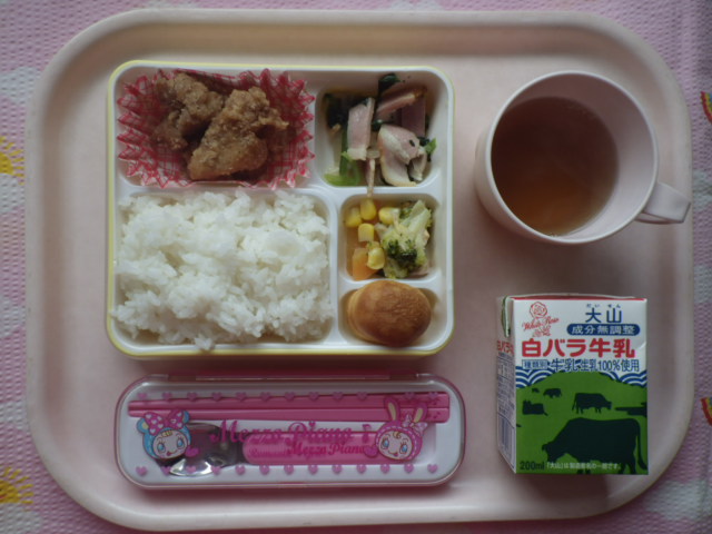 みんなの好きな鶏のから揚げだ★ ★ごはん ◆鶏のから揚げ ◆●ほうれん草ソテー ◆●ツナサラダ ★プチケーキ ※あたたかいご飯はおかわり自由です。 ※牛乳は希望者のみです。 ★熱や力になるもの ◆血や肉になるもの ●体の調子を整えるもの ツイート