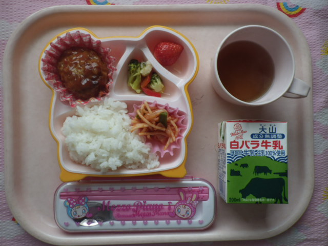 コトコト煮込んだハンバーグ★ ★ごはん ◆煮込みハンバーグ ★◆●ナポリタン ●花野菜サラダ ●いちご ※あたたかいご飯はおかわり自由です。 ※牛乳は希望者のみです。 ★熱や力になるもの ◆血や肉になるもの ●体の調子を整えるもの ツイート