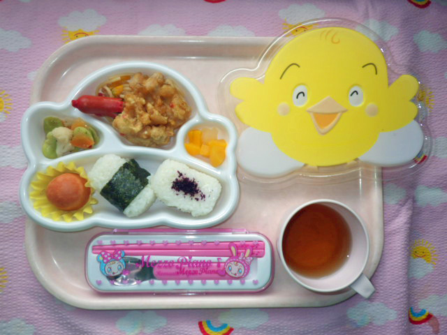 ★菜の花パスタ ★鶏のあられ揚げ ★たこさんウィンナー ★そら豆サラダ ★フルーツミックス ★いちごプチケーキ ★おにぎり(のり・ゆかり)