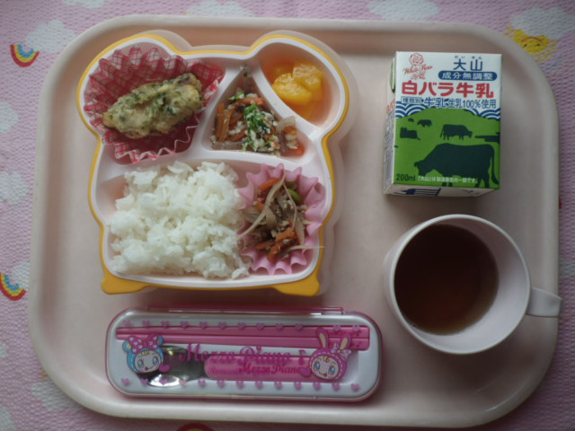 しゃきしゃききんぴら★よくかんでね! ★ごはん ◆タラの海苔天ぷら ◆●きんぴらごぼう ◆●白和え ★黄桃缶 ※あたたかいご飯はおかわり自由です。 ※牛乳は希望者のみです。 ★熱や力になるもの ◆血や肉になるもの ●体の調子を整えるもの ツイート