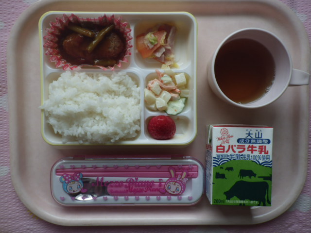 ビタミンCたっぷり!真っ赤ないちご★ ★ごはん ◆●ハンバーグ デミソース ◆●白菜ベーコン煮 ★●ポテトサラダ ●いちご ※あたたかいご飯はおかわり自由です。 ※牛乳は希望者のみです。 ★熱や力になるもの ◆血や肉になるもの ●体の調子を整えるもの ツイート