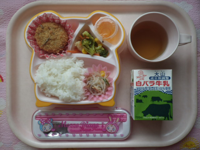 じゃこがたっぷり!コッロケ★ ★ごはん ★◆じゃこコッロケ ◆●春雨ソテー ●ブッロコリーサラダ ★ゼリー ※あたたかいご飯はおかわり自由です。 ※牛乳は希望者のみです。 ★熱や力になるもの ◆血や肉になるもの ●体の調子を整えるもの ツイート