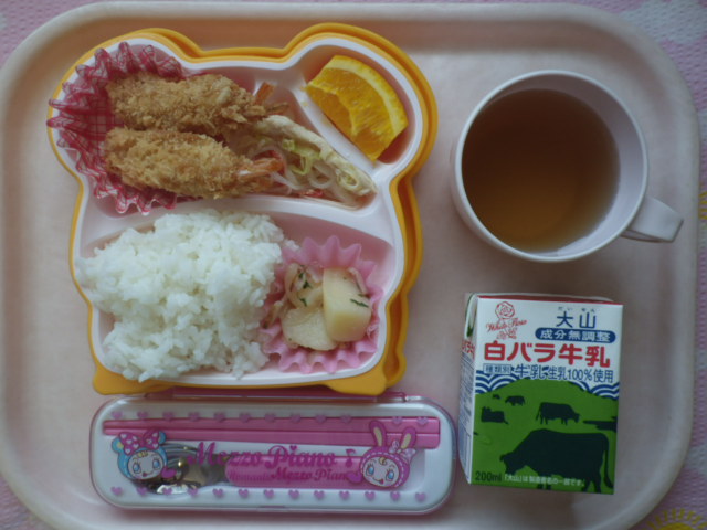 サクサク楽しい!エビフライ★ ★ごはん ◆エビフライ ★◆●ジャーマンポテト ●春雨サラダ ●オレンジ ※あたたかいご飯はおかわり自由です。 ※牛乳は希望者のみです。 ★熱や力になるもの ◆血や肉になるもの ●体の調子を整えるもの ツイート